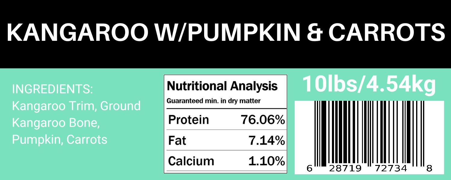 This recipe consists of 70% Kangaroo, 10% Kangaroo Bone, 15% Pumpkin and 5% Carrots.
