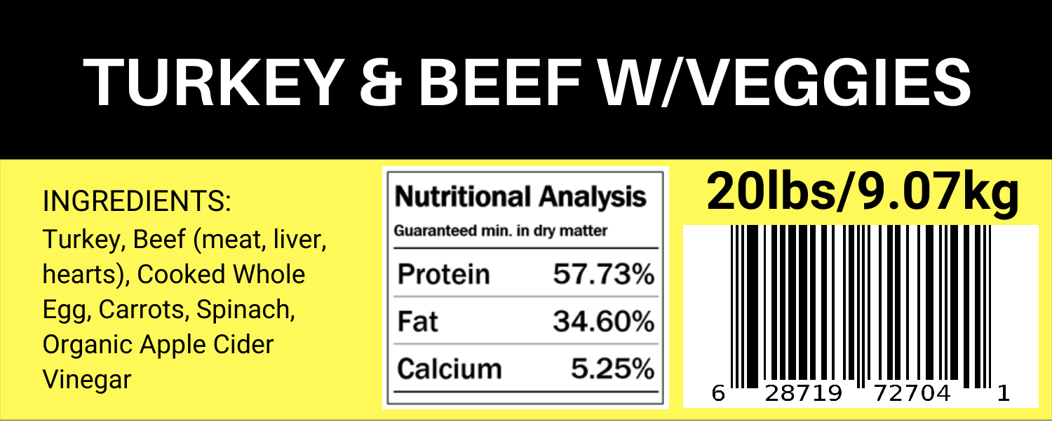 This recipe consists of 45% Bone-In Turkey, 30% Canadian Beef (includes high-value beef heart, liver and kidney organ meats), 20% Whole Cooked Egg and 5% Spinach, Carrots & Organic Apple Cider Vinegar.